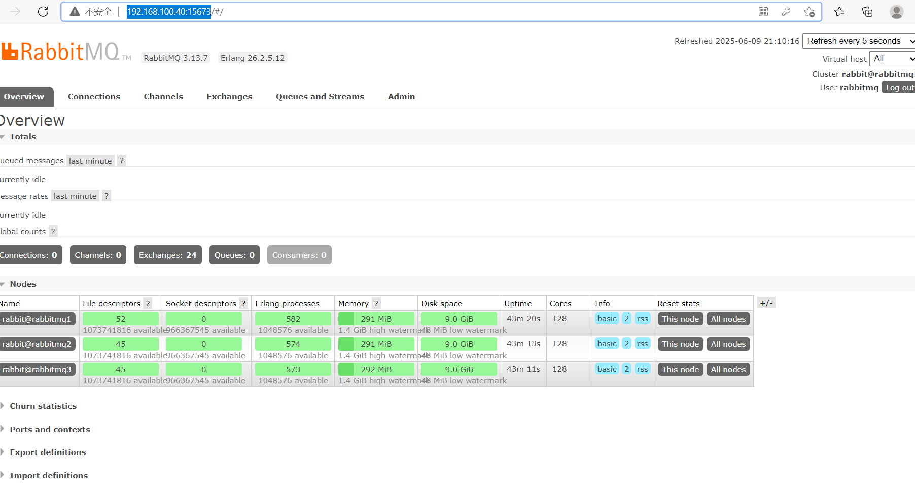 # 进入rabbitmq文件夹下 cd /home/rabbitmq # 编写docker compose文件 vim docker-compose.yml services: rabbitmq1: image: rabbitmq:3-management container_name: rabbitmq1 hostname: rabbitmq1 environment: RABBITMQ_DEFAULT_USER: xxxx RABBITMQ_DEFAULT_PASS: xxxx