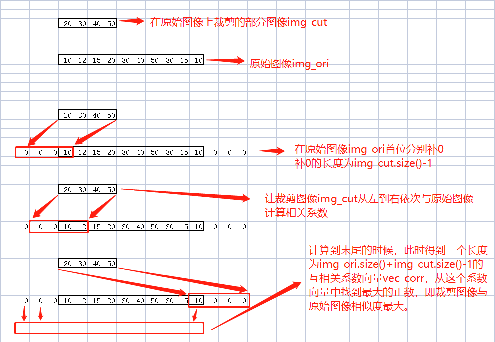 比较到7次(M)的时候相关系数为1,说明此时原始图像上的片段与裁剪图像完全相似。那裁剪图像在原始图像上相似的位置为M - img_cut.size() 即7 - 4 = 3