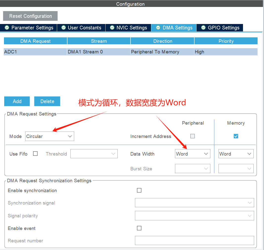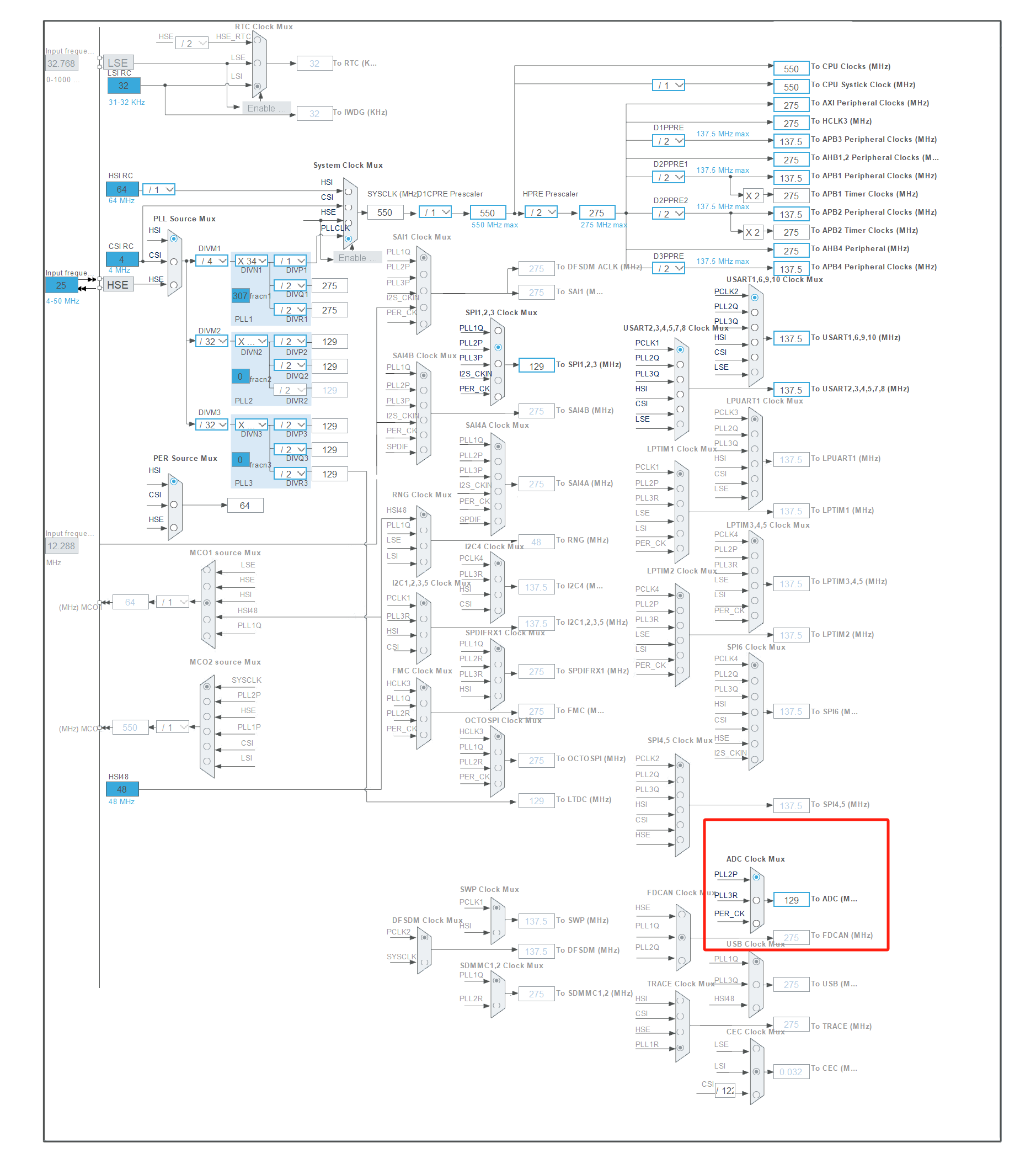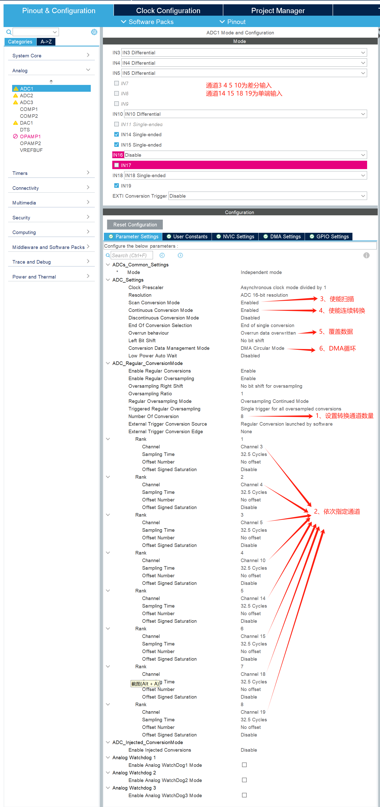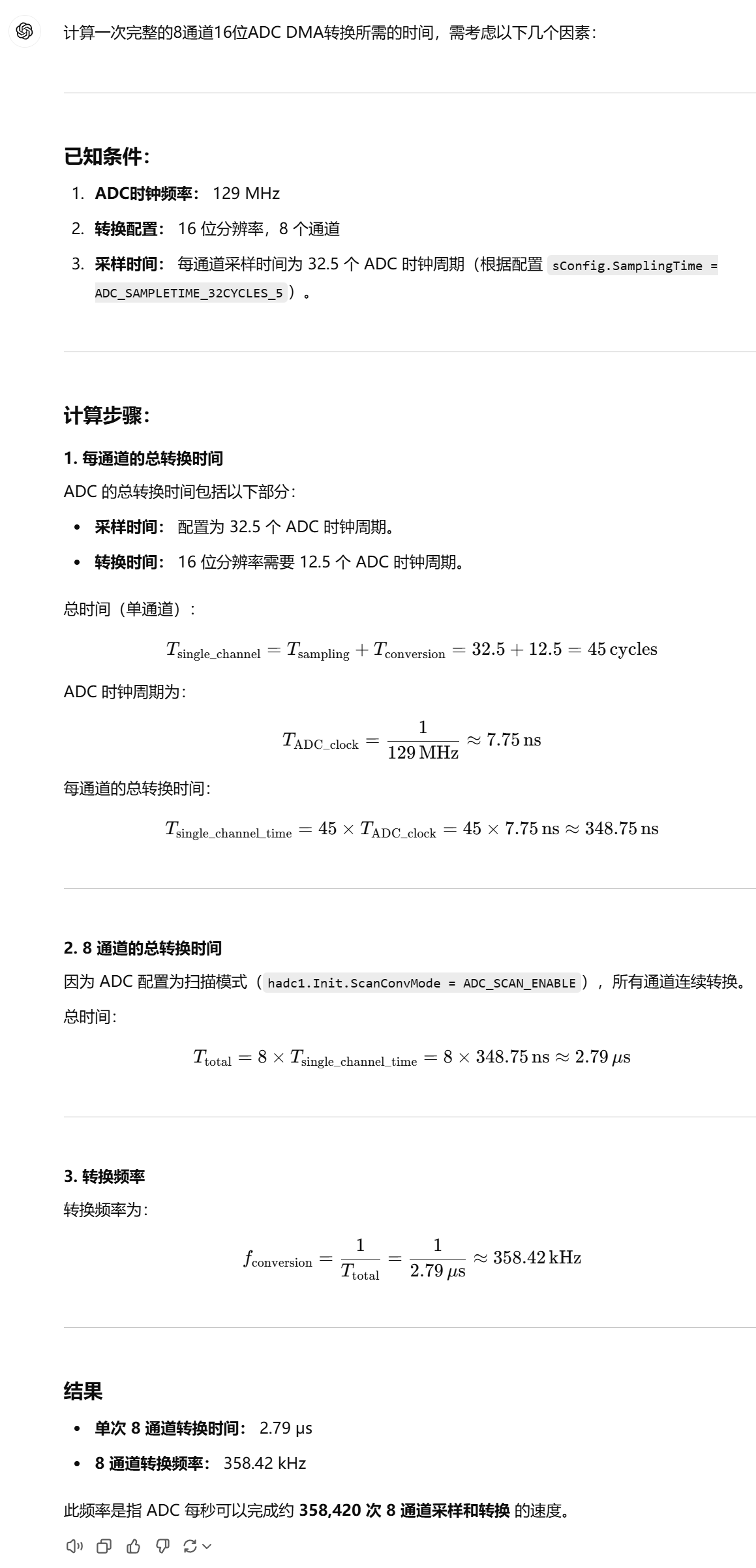 /* ADC1 初始化函数 */ void MX_ADC1_Init(void) { /* 用户代码部分:ADC1初始化开始 0 */ /* 用户代码部分:ADC1初始化结束 0 */ /* 定义多模式和通道配置结构体 */ ADC_MultiModeTypeDef multimode = {0}; ADC_ChannelConfTypeDef sConfig = {0}; /* 用户代码部分:ADC1初始化开始 1 */ /* 用户代码部分:ADC1初始化结束 1 */ /** 公共配置部分 * 配置ADC的主要参数,包括时钟分频、分辨率、扫描模式等。 */ hadc1.Instance = ADC1; // 选择ADC1外设 hadc1.Init.ClockPrescaler = ADC_CLOCK_ASYNC_DIV1; // 异步时钟分频设为1 hadc1.Init.Resolution = ADC_RESOLUTION_16B; // 设置ADC分辨率为16位 hadc1.Init.ScanConvMode = ADC_SCAN_ENABLE; // 启用扫描转换模式 hadc1.Init.EOCSelection = ADC_EOC_SINGLE_CONV; // 每次转换完成触发中断 hadc1.Init.LowPowerAutoWait = DISABLE; // 禁用低功耗自动等待模式 hadc1.Init.ContinuousConvMode = ENABLE; // 启用连续转换模式 hadc1.Init.NbrOfConversion = 8; // 设置总共8个通道 hadc1.Init.DiscontinuousConvMode = DISABLE; // 禁用不连续转换模式 hadc1.Init.ExternalTrigConv = ADC_SOFTWARE_START; // 使用软件触发开始转换 hadc1.Init.ExternalTrigConvEdge = ADC_EXTERNALTRIGCONVEDGE_NONE; // 不使用外部触发沿 hadc1.Init.ConversionDataManagement = ADC_CONVERSIONDATA_DMA_CIRCULAR; // 启用DMA循环模式 hadc1.Init.Overrun = ADC_OVR_DATA_OVERWRITTEN; // 允许数据覆盖 hadc1.Init.LeftBitShift = ADC_LEFTBITSHIFT_NONE; // 无左移操作 hadc1.Init.OversamplingMode = ENABLE; // 启用过采样 hadc1.Init.Oversampling.Ratio = 1; // 过采样比例为1(无实际效果) hadc1.Init.Oversampling.RightBitShift = ADC_RIGHTBITSHIFT_NONE; // 无右移操作 hadc1.Init.Oversampling.TriggeredMode = ADC_TRIGGEREDMODE_SINGLE_TRIGGER; // 单触发模式 hadc1.Init.Oversampling.OversamplingStopReset = ADC_REGOVERSAMPLING_CONTINUED_MODE; // 连续模式 if (HAL_ADC_Init(&hadc1) != HAL_OK) { Error_Handler(); // 如果初始化失败,调用错误处理函数 } /** 配置ADC多模式 * 设置ADC工作模式为独立模式。 */ multimode.Mode = ADC_MODE_INDEPENDENT; if (HAL_ADCEx_MultiModeConfigChannel(&hadc1, &multimode) != HAL_OK) { Error_Handler(); } /** 配置常规通道 * 设置每个通道的采样时间、通道序号及其他参数。 */ sConfig.Channel = ADC_CHANNEL_3; // 通道3 sConfig.Rank = ADC_REGULAR_RANK_1; // 排在序列第1位 sConfig.SamplingTime = ADC_SAMPLETIME_32CYCLES_5; // 采样时间为32.5周期 sConfig.SingleDiff = ADC_DIFFERENTIAL_ENDED; // 配置为差分输入 sConfig.OffsetNumber = ADC_OFFSET_NONE; // 无偏移校正 sConfig.Offset = 0; // 偏移值为0 sConfig.OffsetSignedSaturation = DISABLE; // 禁用偏移值饱和处理 if (HAL_ADC_ConfigChannel(&hadc1, &sConfig) != HAL_OK) { Error_Handler(); } /** 按序为其他通道配置参数 * 每次更改通道号和序列编号,其余参数保持一致。 */ sConfig.Channel = ADC_CHANNEL_4; sConfig.Rank = ADC_REGULAR_RANK_2; if (HAL_ADC_ConfigChannel(&hadc1, &sConfig) != HAL_OK) { Error_Handler(); } sConfig.Channel = ADC_CHANNEL_5; sConfig.Rank = ADC_REGULAR_RANK_3; if (HAL_ADC_ConfigChannel(&hadc1, &sConfig) != HAL_OK) { Error_Handler(); } sConfig.Channel = ADC_CHANNEL_10; sConfig.Rank = ADC_REGULAR_RANK_4; if (HAL_ADC_ConfigChannel(&hadc1, &sConfig) != HAL_OK) { Error_Handler(); } sConfig.Channel = ADC_CHANNEL_14; sConfig.Rank = ADC_REGULAR_RANK_5; sConfig.SingleDiff = ADC_SINGLE_ENDED; // 改为单端输入 if (HAL_ADC_ConfigChannel(&hadc1, &sConfig) != HAL_OK) { Error_Handler(); } sConfig.Channel = ADC_CHANNEL_15; sConfig.Rank = ADC_REGULAR_RANK_6; if (HAL_ADC_ConfigChannel(&hadc1, &sConfig) != HAL_OK) { Error_Handler(); } sConfig.Channel = ADC_CHANNEL_18; sConfig.Rank = ADC_REGULAR_RANK_7; if (HAL_ADC_ConfigChannel(&hadc1, &sConfig) != HAL_OK) { Error_Handler(); } sConfig.Channel = ADC_CHANNEL_19; sConfig.Rank = ADC_REGULAR_RANK_8; if (HAL_ADC_ConfigChannel(&hadc1, &sConfig) != HAL_OK) { Error_Handler(); } /* 用户代码部分:ADC1初始化结束 2 */ /* 用户代码部分:ADC1初始化结束 */ }