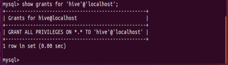 - 配置mysql允许hive接入 show grants for 'hive'@'localhost';