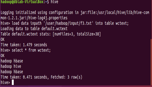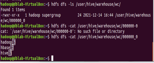 10.从hdfs导入文件内容到表wctext, 并查看hdfs源文件,hfds数据库文件