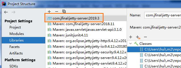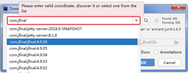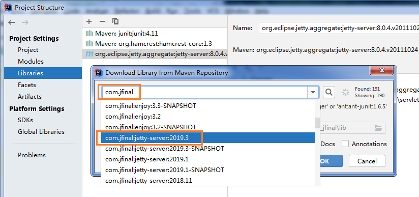 Project Structure --> Libraries --> "+"号 --> 输入"com.jfinal" --> 点击输入框右侧的搜索图标,就会显示好几个版本。