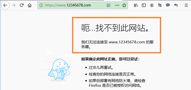直接在浏览器(这次用的浏览器是火狐)里输入域名地址,如果是还没注册的域名,很快有提示,在一秒内就会有提示,提示信息如下: