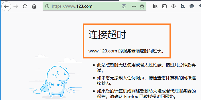如果是已经注册备案,但是由于“墙”等原因连不上的网站,提示信息会较慢出现,约几秒钟之后,提示信息如下: