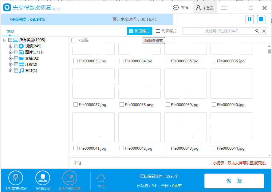 搜索“sd恢复”,就能找到很多的数据恢复软件。选一下就可以搜索到数据了。这个软件可以恢复,但是要注册,登录。估计到最后还得要收钱(交钱办会员了,只是,只能恢复一点点数据,没什么用。),所以,又找了另外一个软件DiskGenius,这个免费的,还好用。
