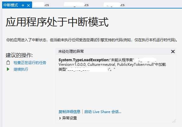 1.“处于中断模式”只是表面,要看异常的具体提示“未能从程序集XXXX...加载类型XXX", 原因是我的exe程序和dll文件时使用的相同的名字,把dll的生成名字改一下就行,如下: