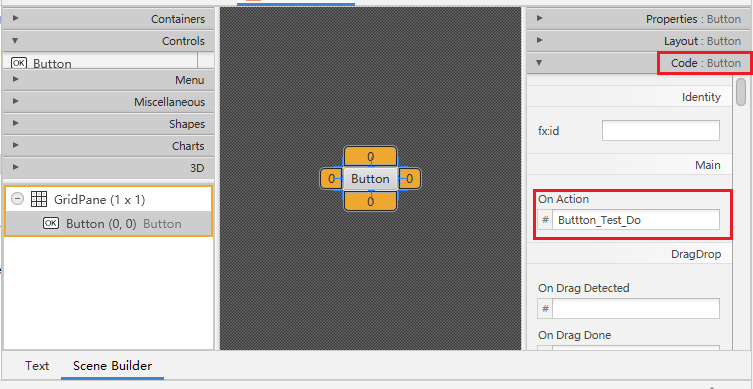 在Scence Builder界面选中按钮,右边就会出现属性栏,点开 Code:Button项,再点开On Action 项,在方框里填入函数名,如下图中填入了“Button_Test_Do”,