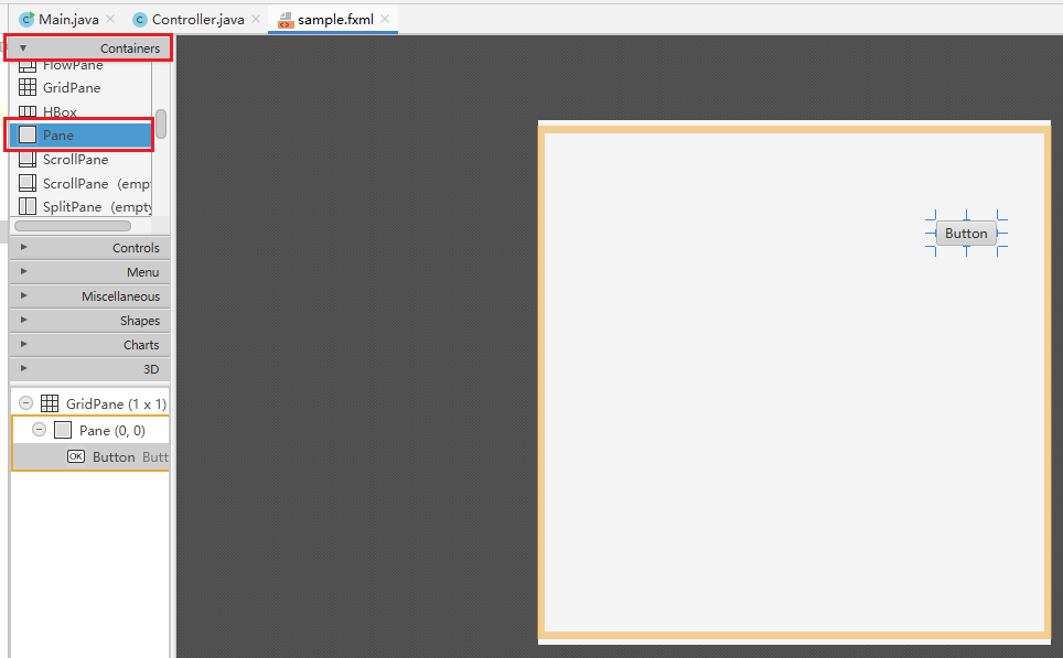 和C#, Android Studio 一样的操作方式,而且操作方式也大同小异。比如,当要画一个按钮时,在 Scene Builder 模式下,把Button拖拽出来即可。
