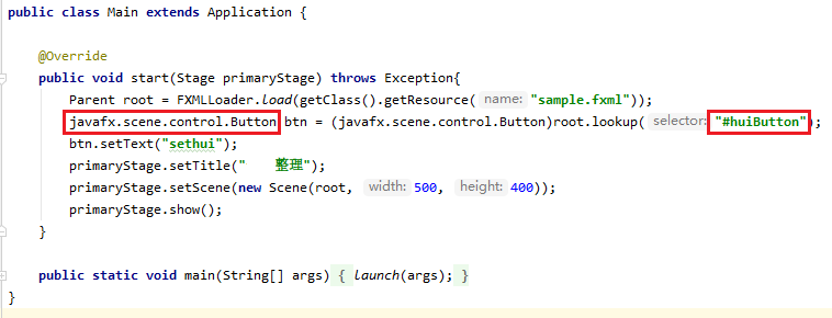 在fxml文件里,button的ID是“huiButton”, 但是填进 lookup() 里时,要加上字符“#”, 写成“#huiButton”,如上图红框中所示。