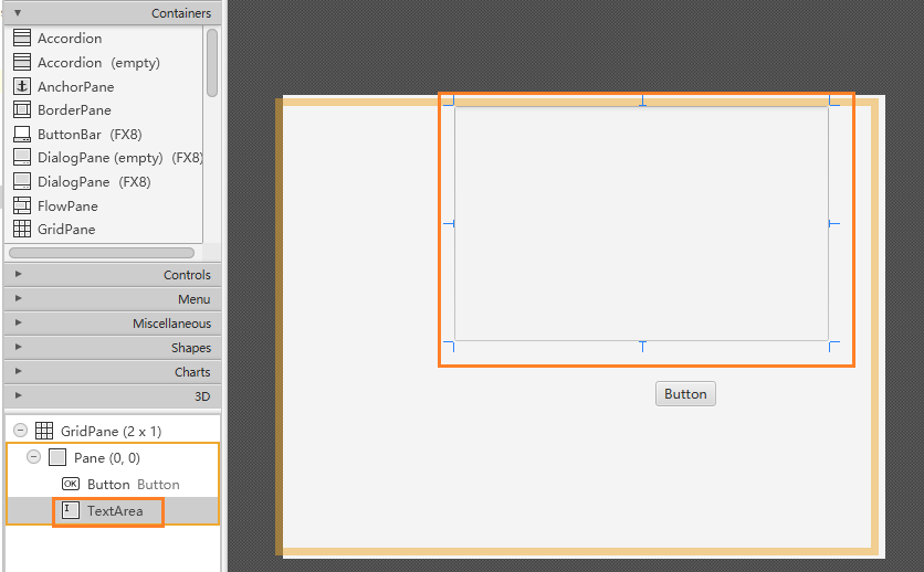 如下图,在先有一个Pane的基础上,再选择Controls-->TextArea。就出现了一个显示的区域。
