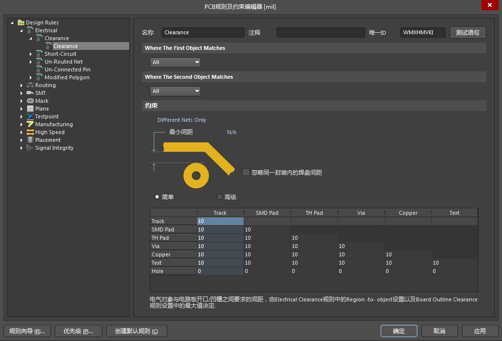 Design-rule-electrical-clearance中的右边的最下方可以设置最小间距为10mil。假如铺地间距要为20mil,可以右键点击clearance,选择new rules,新建规则。选择新建立的规则,在“Where the first object macthes”中选择“net”,然后再右边的下拉菜单中选择“GND”(铺地的网络),然后将起约束条件中右边的最下方的值改为20mil即可。