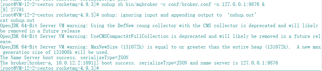 [root@CentOS-7 rocketmq-4.3.0]# nohup sh bin/mqbroker -c conf/broker.conf -n 127.0.0.1:9876 &