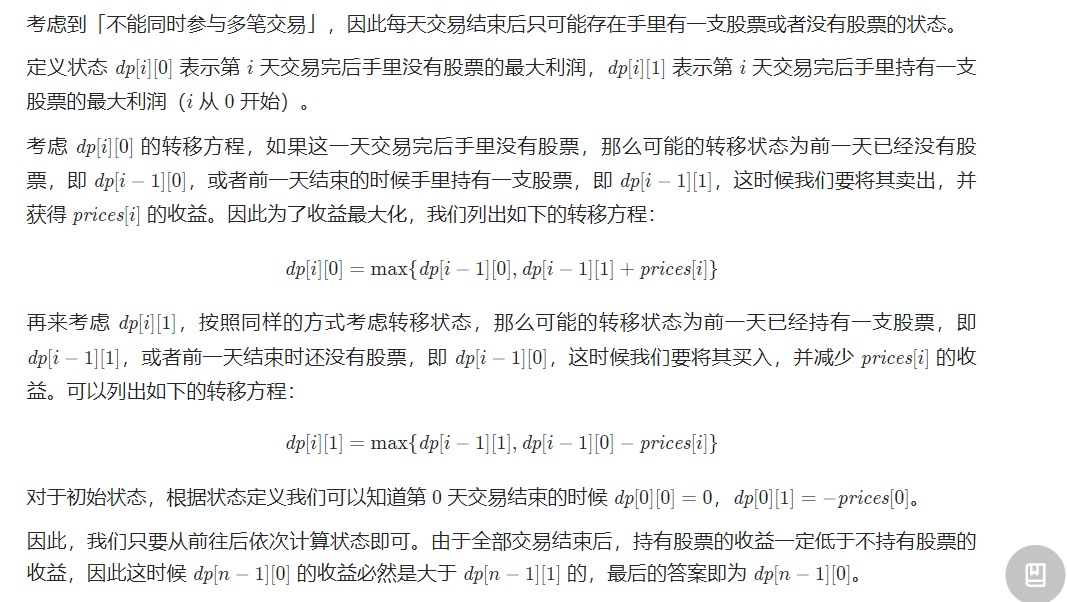 //dp[i][1]:1.i-1天不持股今天买入;2.i-1天持股(最多只能持有一支股票)