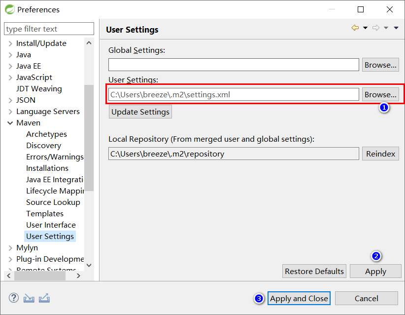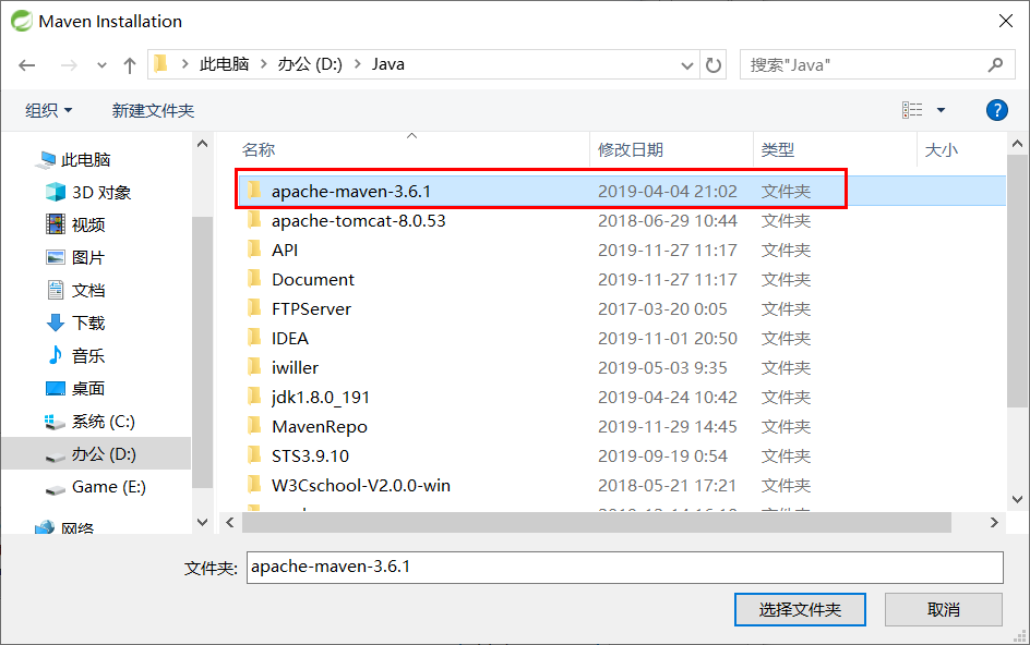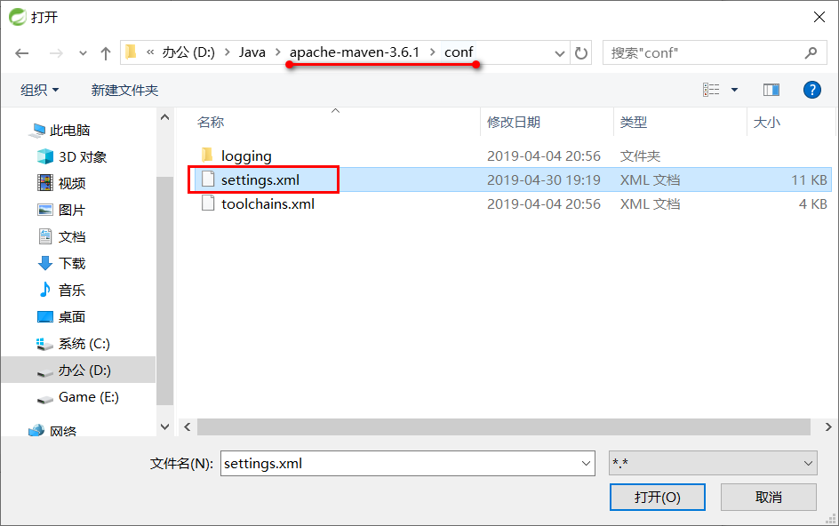 点击Browse...按钮,找到apache-maven-3.6.1\conf目录下的setting.xml文件,如下图,点击下方打开按钮
