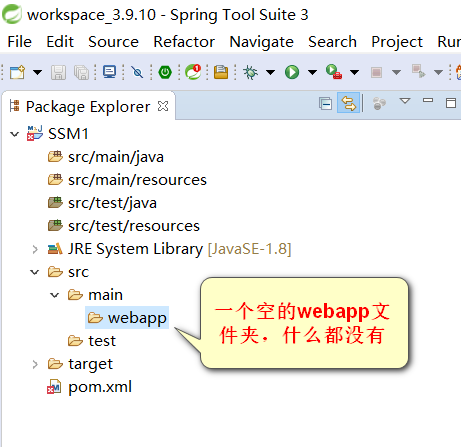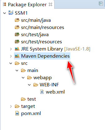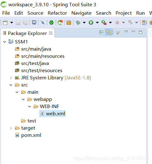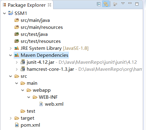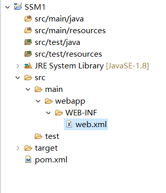 我们会发现,项目中有报错,pom.xml文件和项目文件上有小红叉,这是因为我们建立的是web项目,web项目在WEB-INF目录下应该有一个web.xml文件。而Maven创建的项目中没有,如下图,我们还需要改造一下