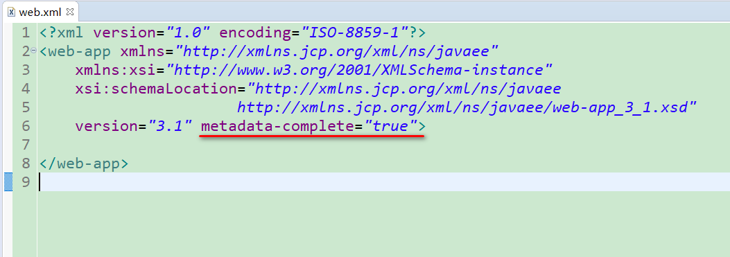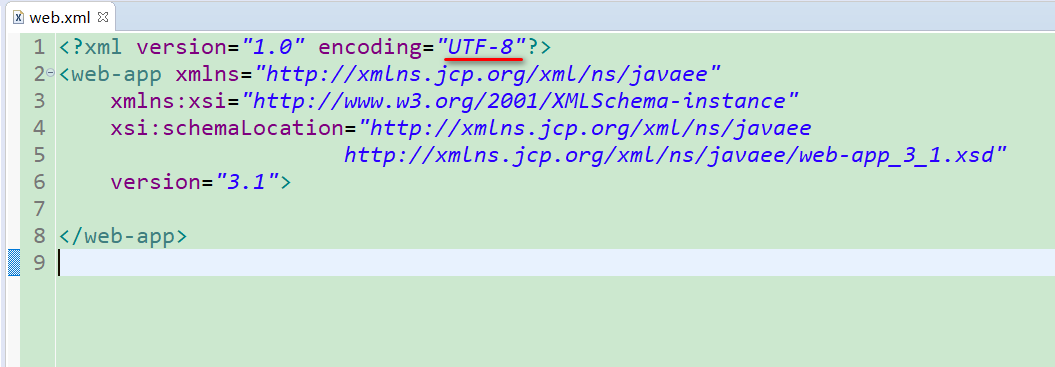 metadata-complete属性:当该属性为true时,web应用将不会加载注解配置的Web组件。我们会在项目中使用注解,所以在这里要么将它的值设为false,要么直接将这个属性删除。我就直接删除了。此外,将encoding的值设为UTF-8,如下: