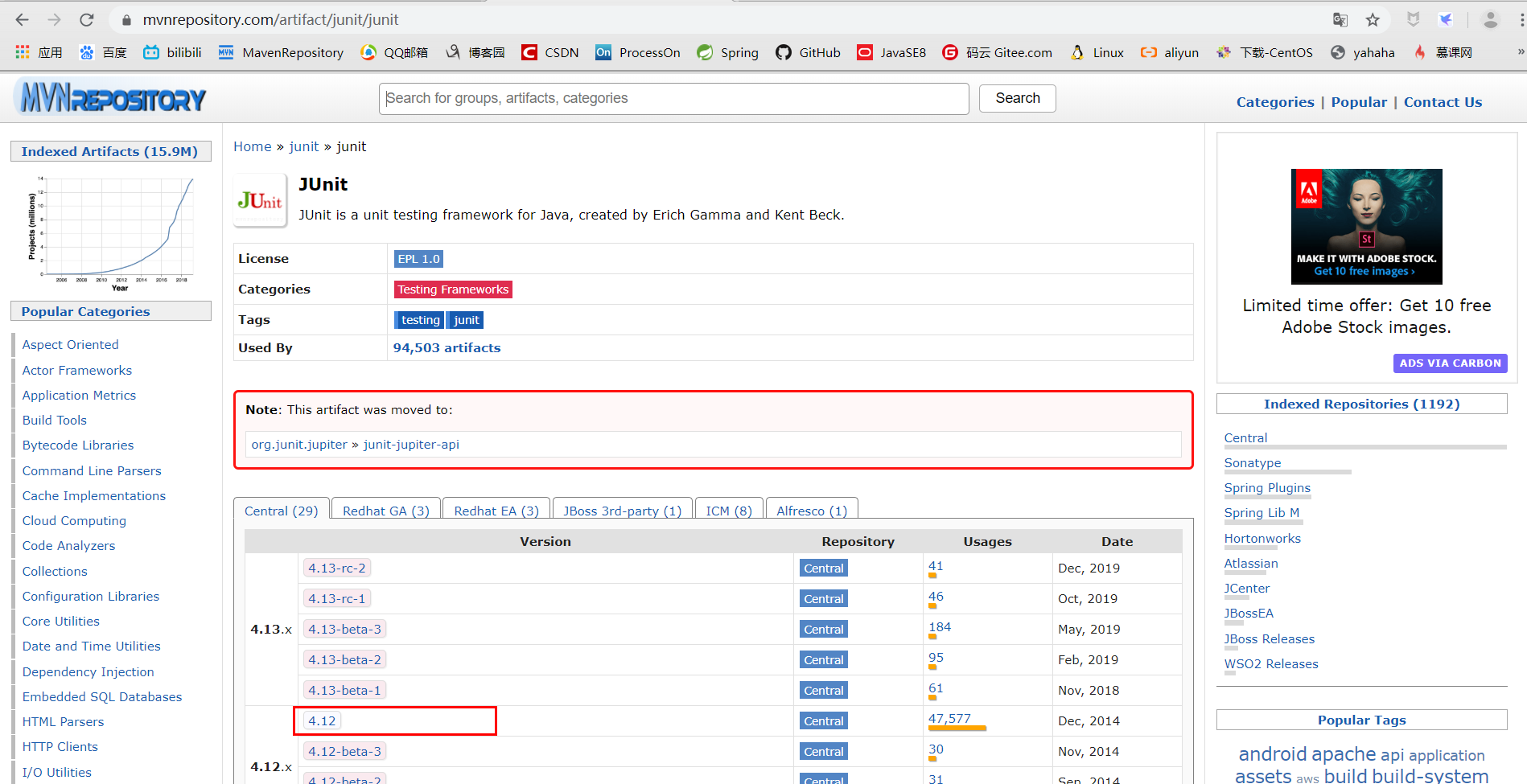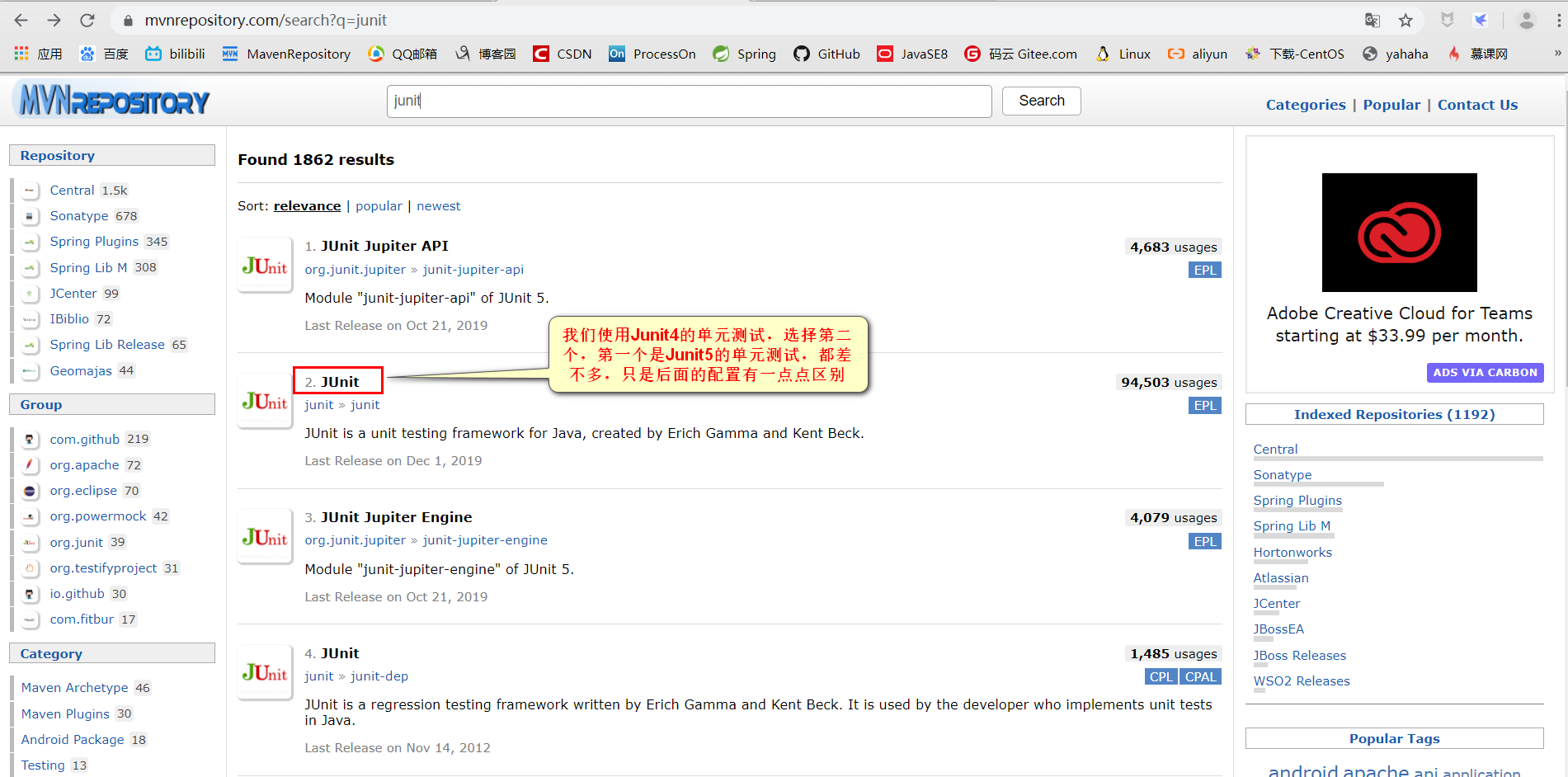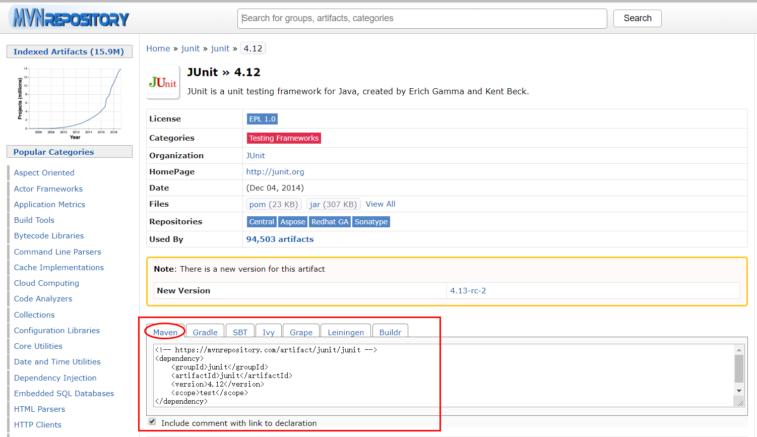在搜索框内输入要找的依赖,然后点击Search,我们现在来搜索单元测试所依赖的坐标,在搜索框中输入junit,点击Search,出现如下页面: