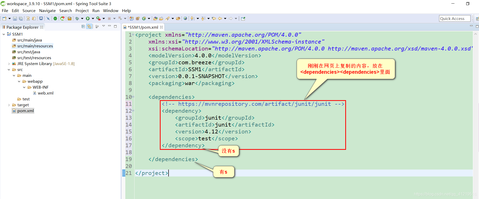 将方框内的代码复制下来,接下来打开pom.xml文件,如下图所示写一个<dependencies></dependencies>标签,依赖的坐标就往这个标签里面放,