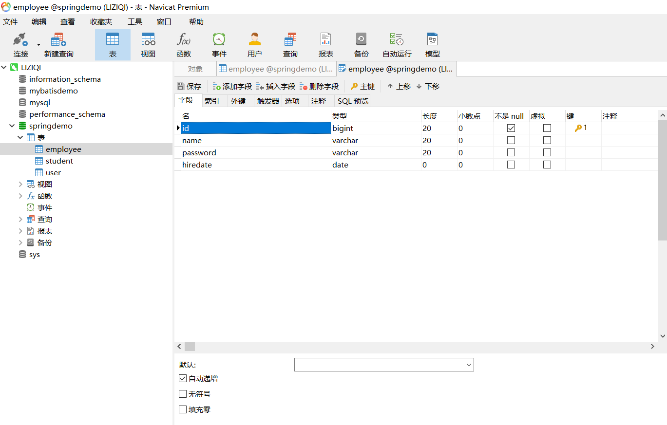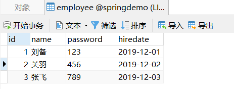 新建一个数据库,名称为springdemo,再新建一个员工表employee