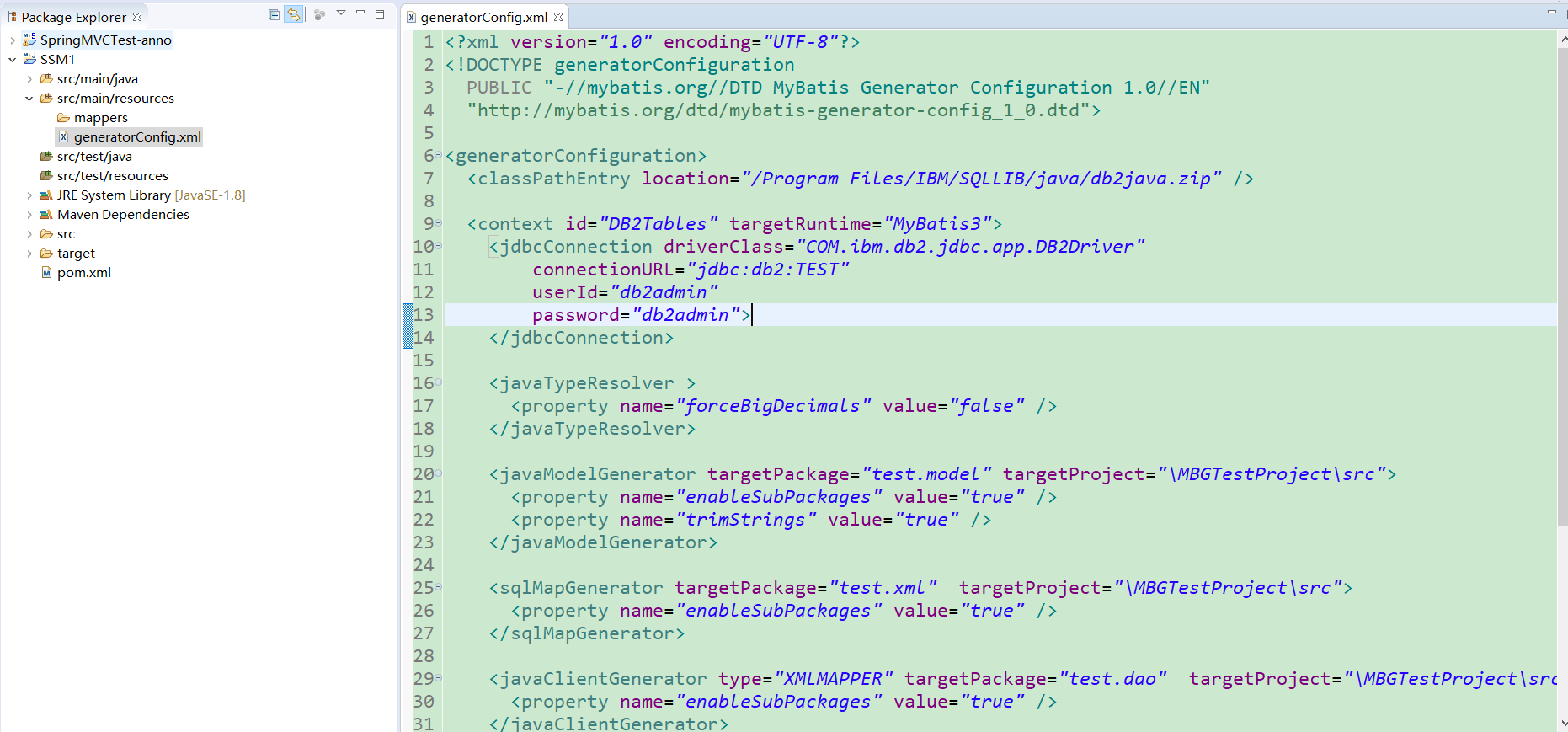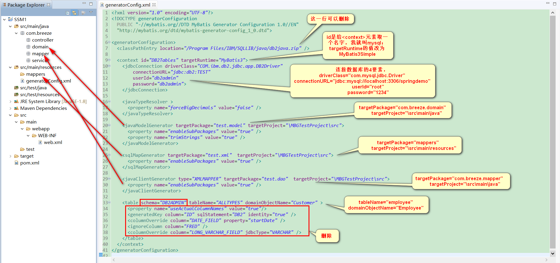 然后把generatorConfig.xml文件中的一些参数值改一下,如下图: