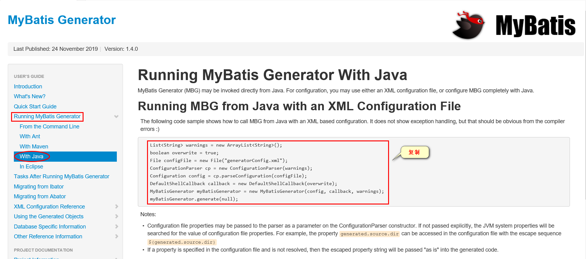 点开Running MyBatis Generator,我们用Java代码的形式运行,所以点击With Java,将右侧的代码复制下来。