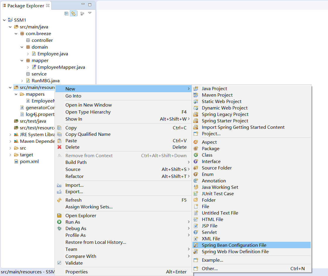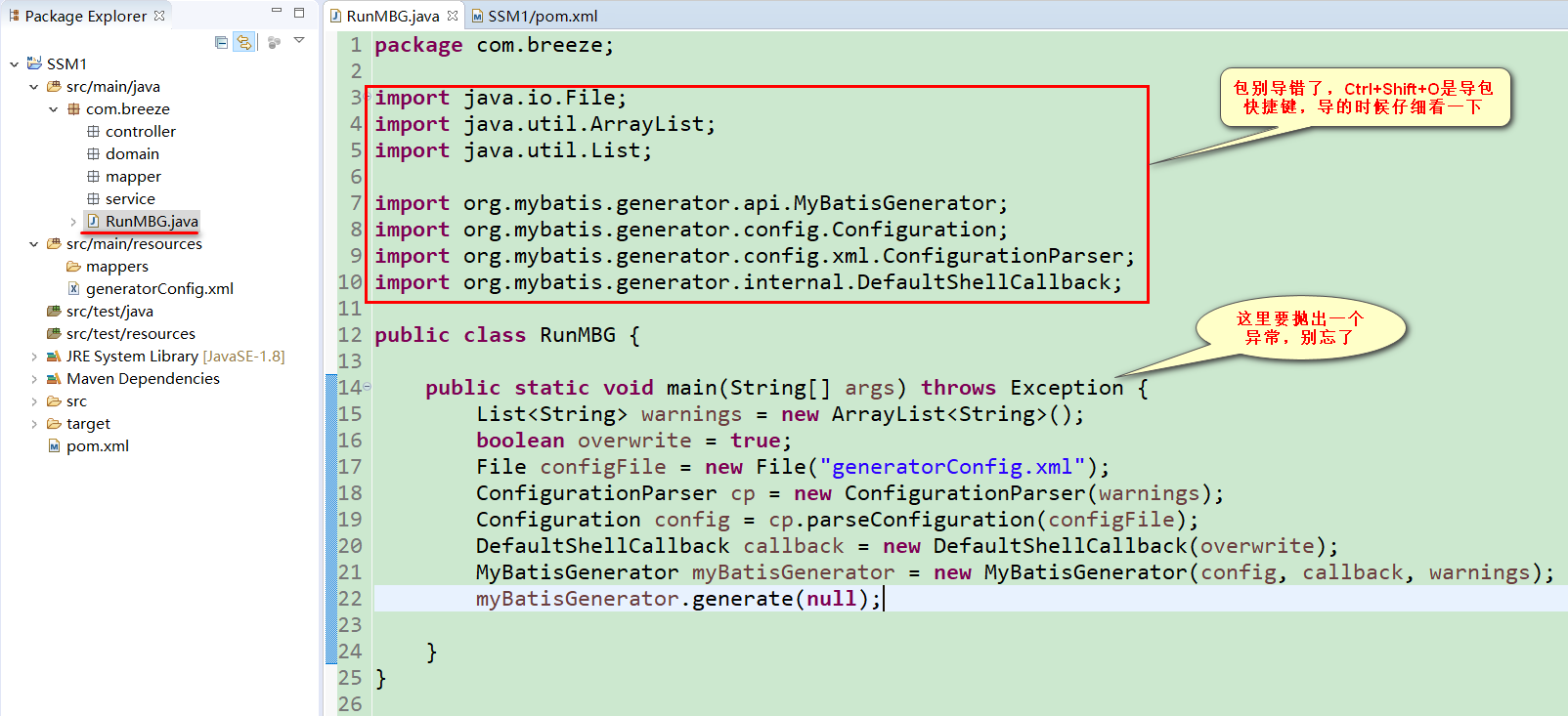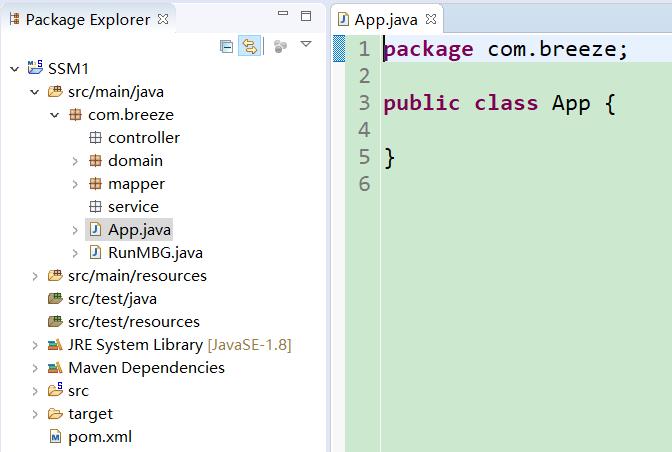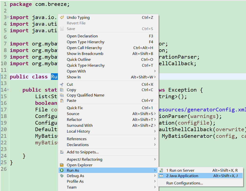在com.breeze包下新建一个Class文件,这个文件是用来启动MyBatis Generator,我将其命名为RunMBG,如下图: