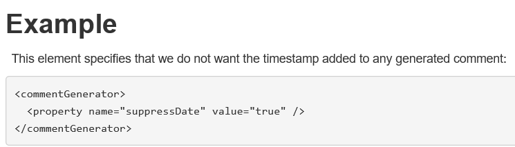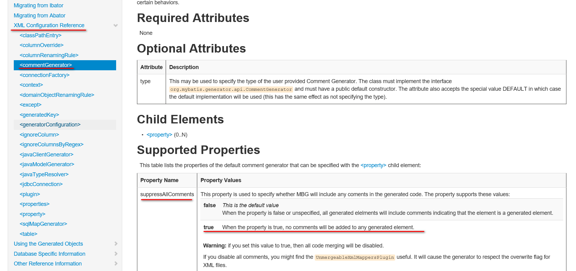 看一下XML配置参考(XML Configuration Reference)下面的注释生成器(<commentGenerator>)下面的支持的属性(Supported Properties)下面的属性名称 suppressAllComments,从文档说明中可以知道,当suppressAllComments的值为true时,不会在任何生成的元素上贴注释,继续往下拉,会有一个例子: