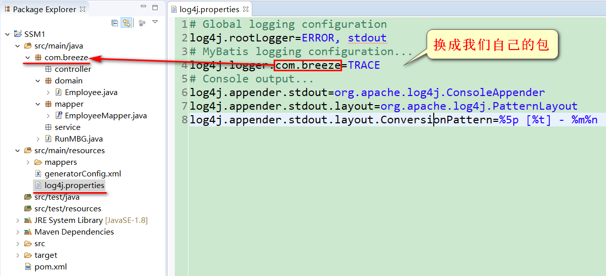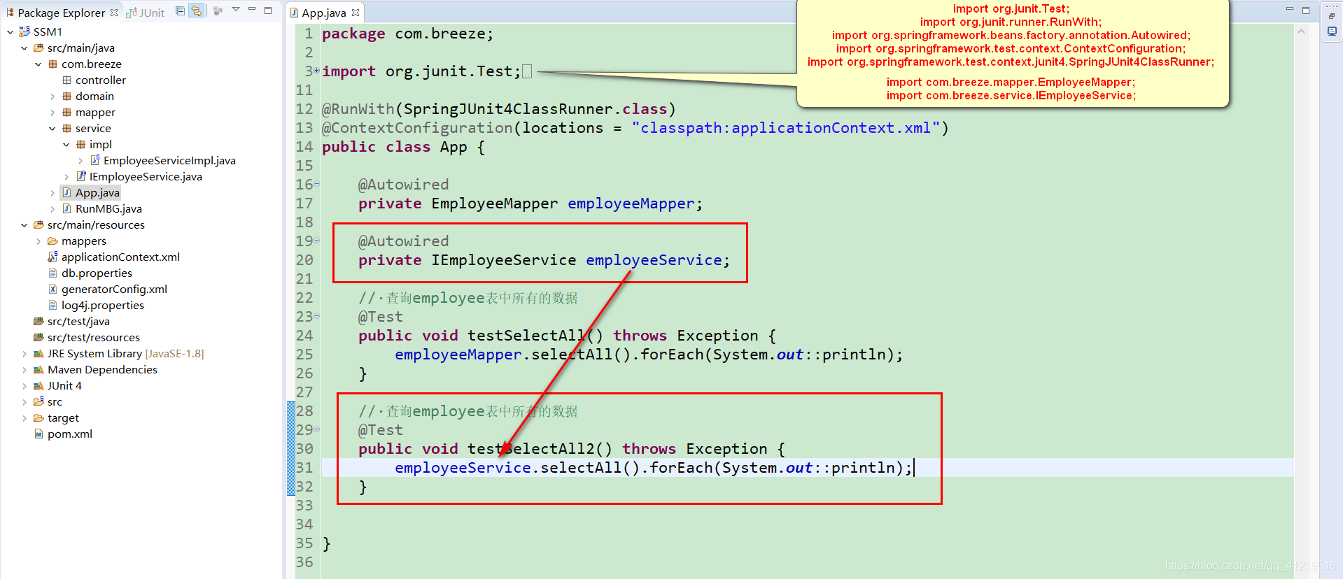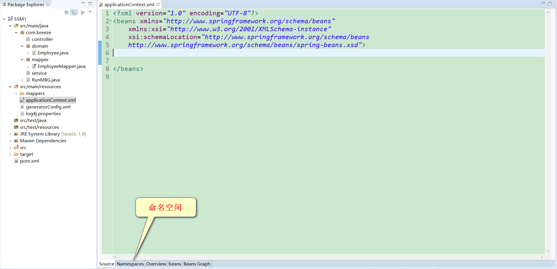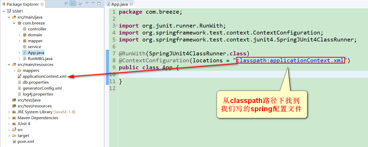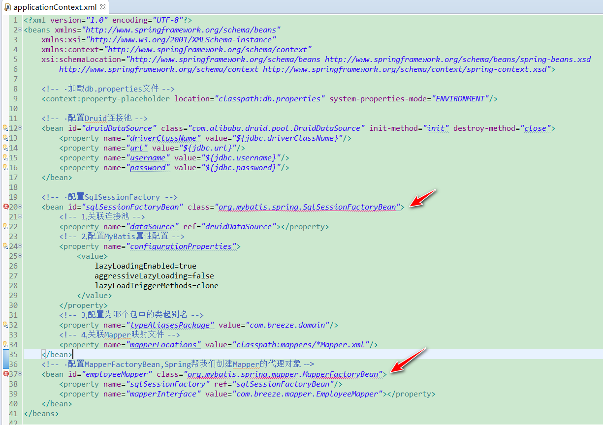 注意,上面我们配置了<context:component-scan base-package="com.breeze"/>,我们在applicationContext.xml中也配置了<context:component-scan base-package="com.breeze"/>,这两个地方只要有一个地方配置就行了,为了看起来清晰一点,我把applicationContext.xml中的注释掉了,保留这里的。