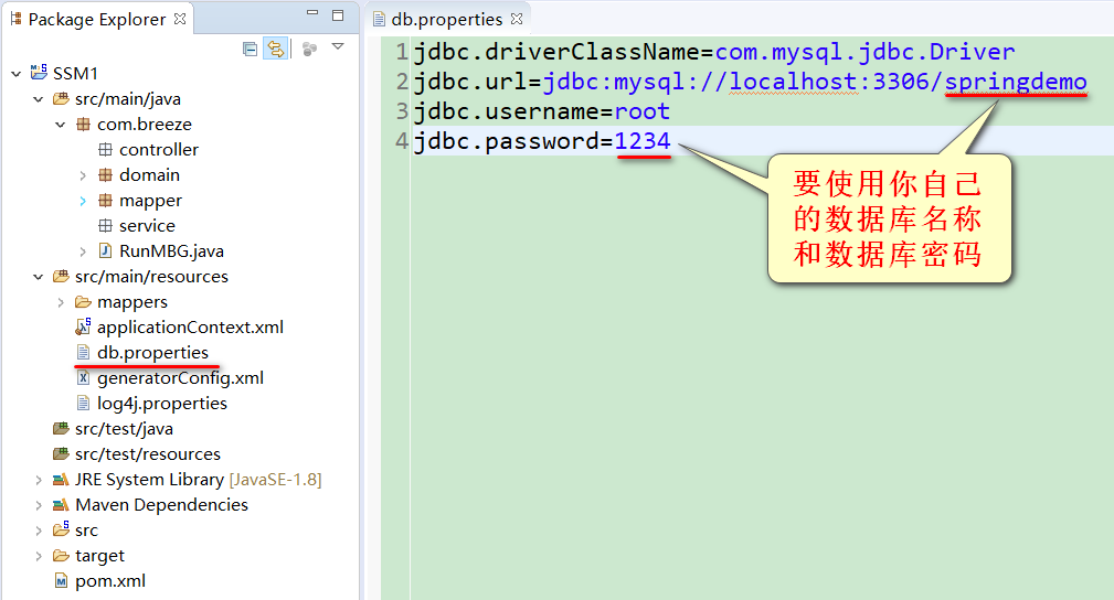 这是连接数据库的四要素,有的同学会发现,我们在前面不是在generatorConfig.xml文件中配过吗?我们在generatorConfig.xml配置的连接数据库的四要素是使用MyBatisGenerator根据数据库中表的信息帮我们自动生成代码(生成代码之后generatorConfig.xml文件也就不再使用了),而这个是我们项目中连接后台数据库的一些配置,我们在增删改查的过程中要通过这个连接数据库。