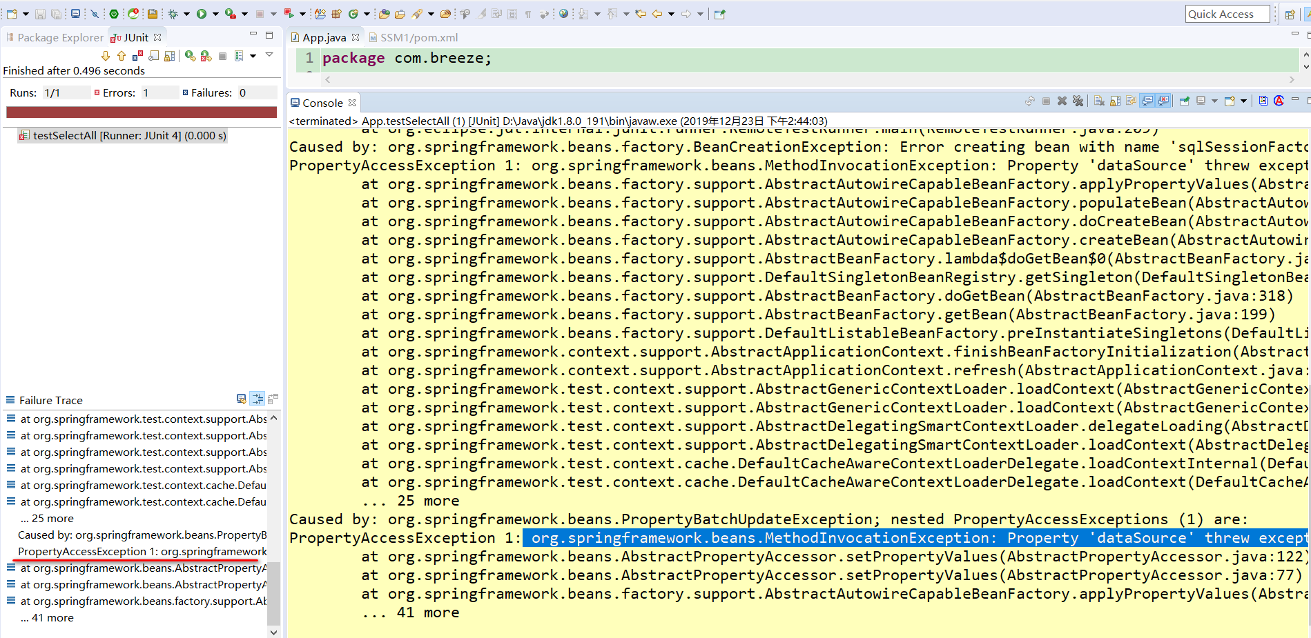 这是说我们没有spring-jdbc这个jar包,同样地,我们在pom.xml文件中加入下面的依赖: