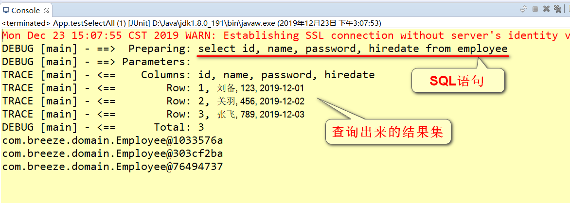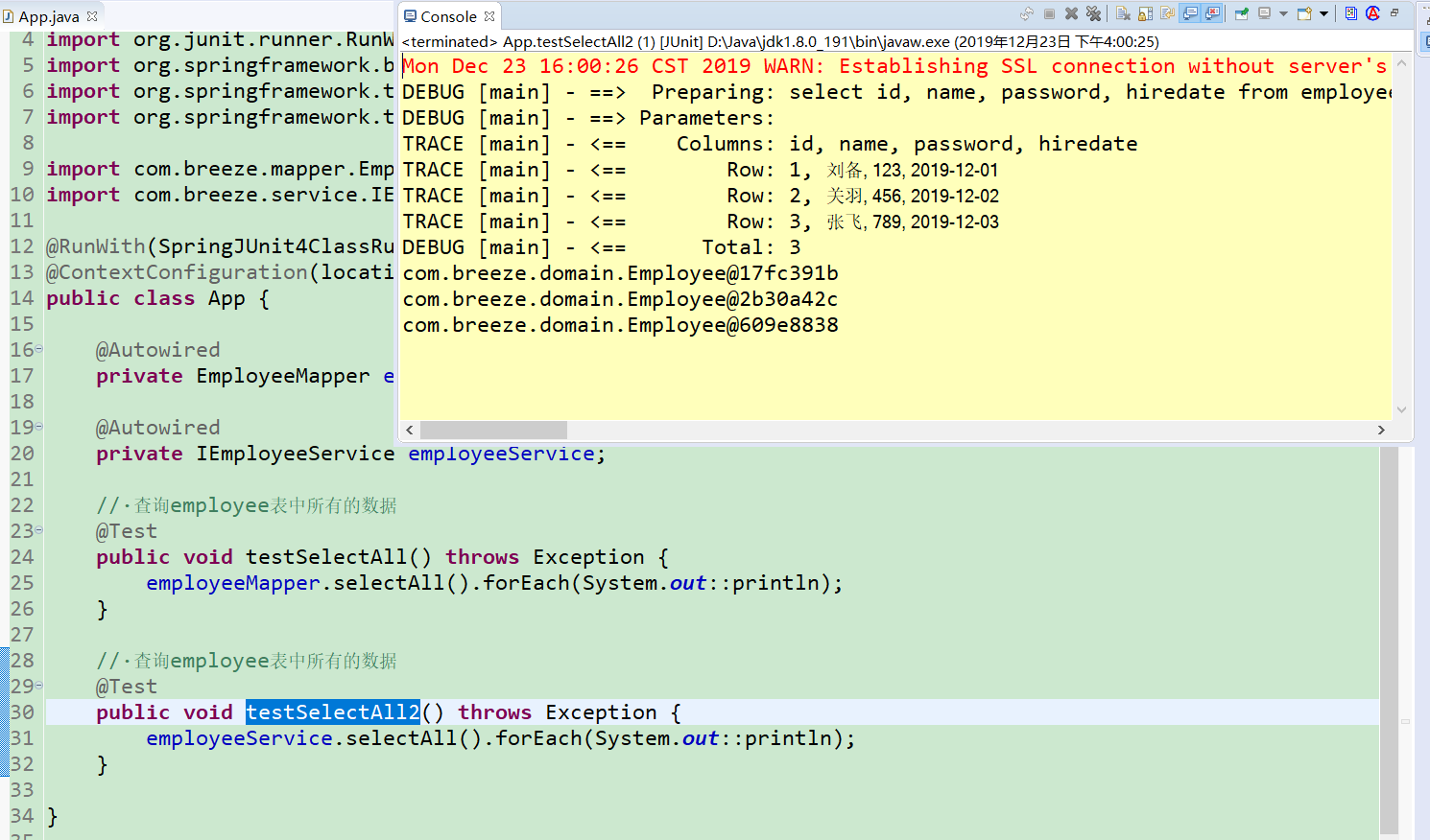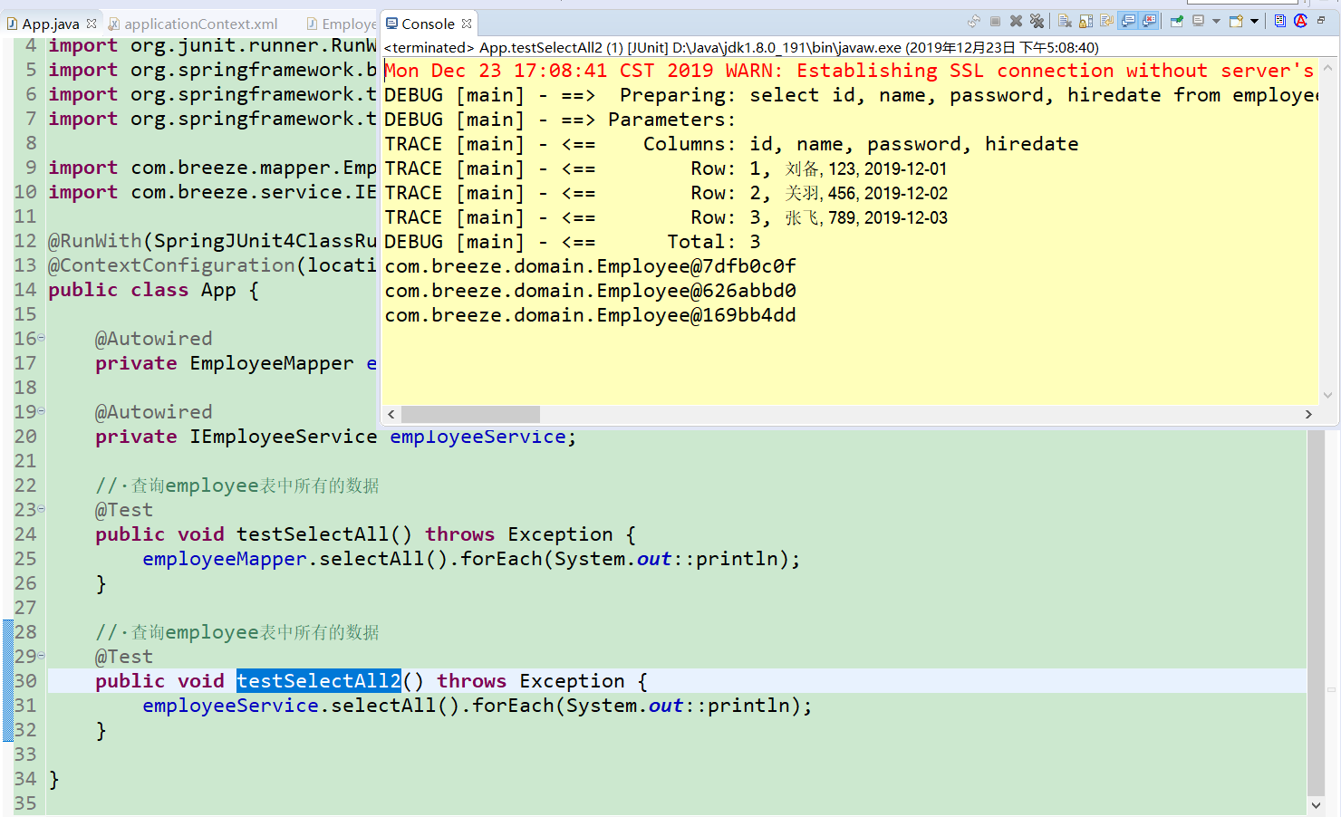 之后在测试类App中重新运行testSelectAll2()方法,结果如下图: