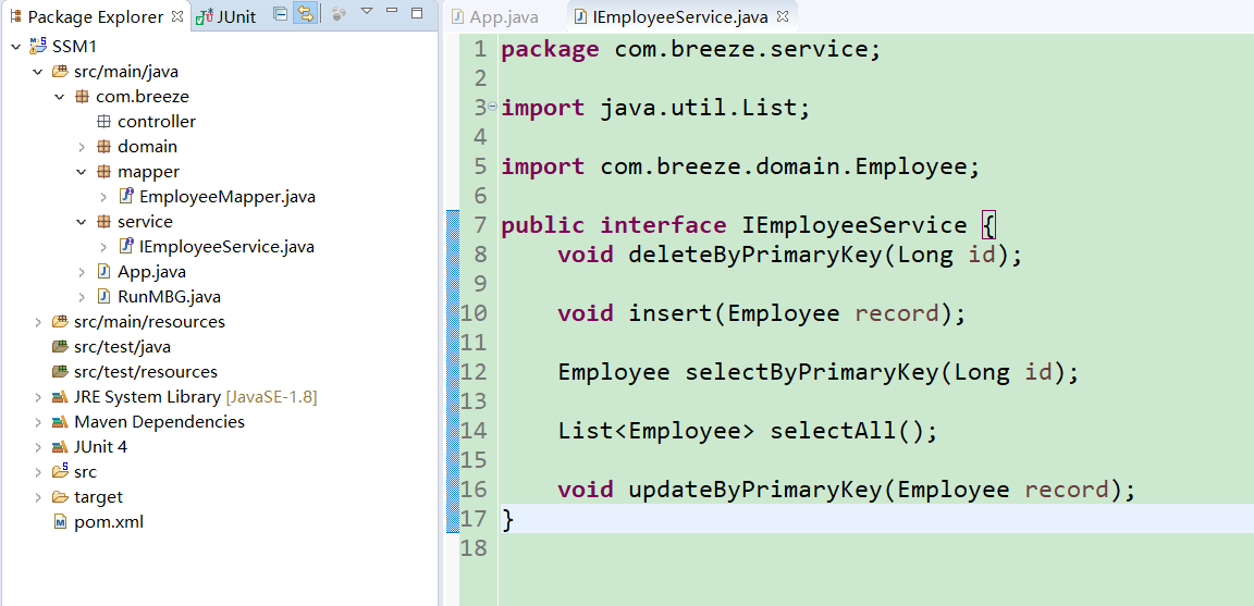 在service包下新建一个接口(interface),命名为IEmployeeService,然后将EmployeeMapper.java中的几个方法拷贝过来:
