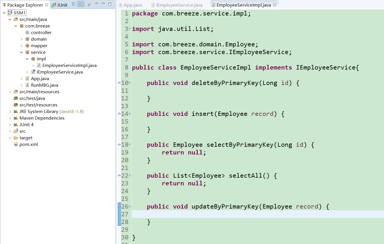 再在service包下新建一个包impl,在impl包里写一个实现类EmployeeServiceImpl去实现IEmployeeService接口: