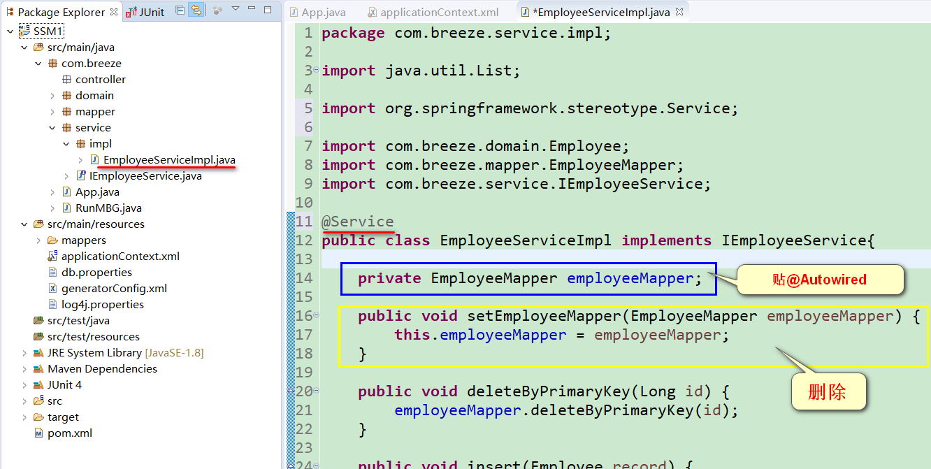 接下来,给Service设置mapper,将上图黄色方框中的内容删除,在蓝色方框上面贴@Autowired注解,此时EmployeeServiceImpl.java文件如下: