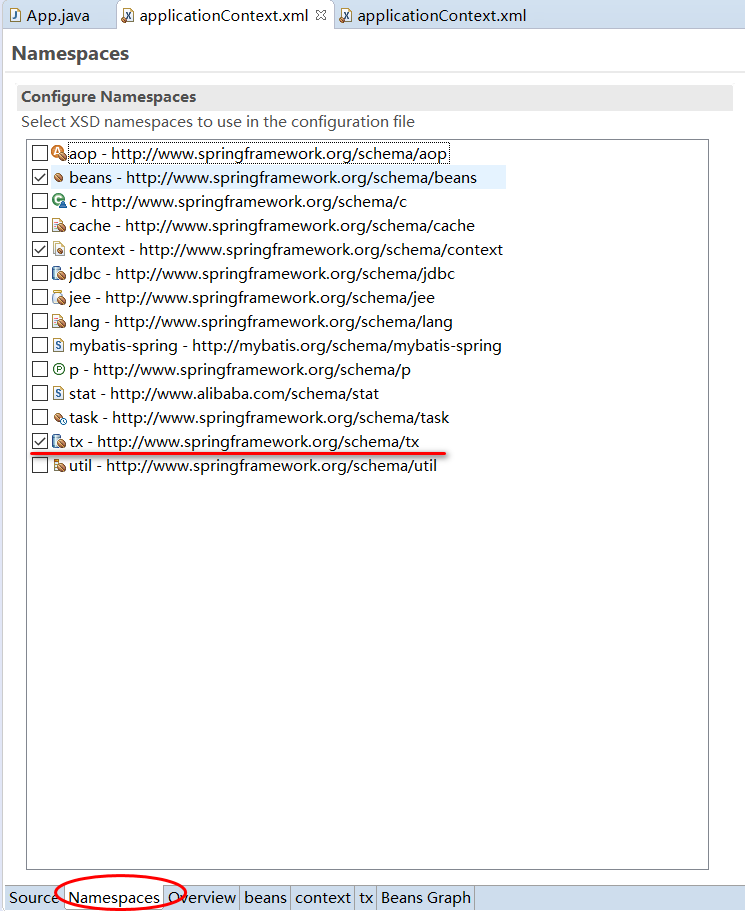 在applicationContext.xml文件中,增加tx命名空间(去掉版本号):