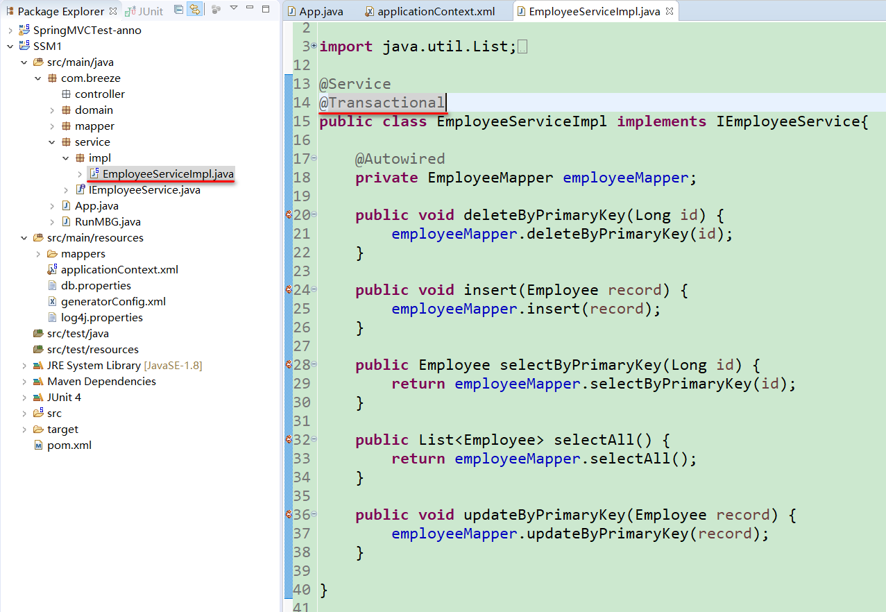 在EmployeeServiceImpl类上贴一个注解:@Transactional