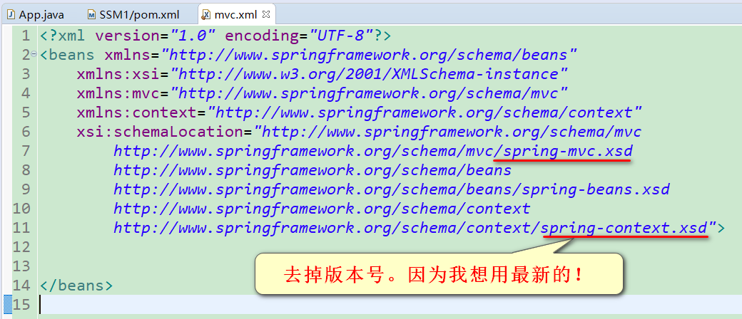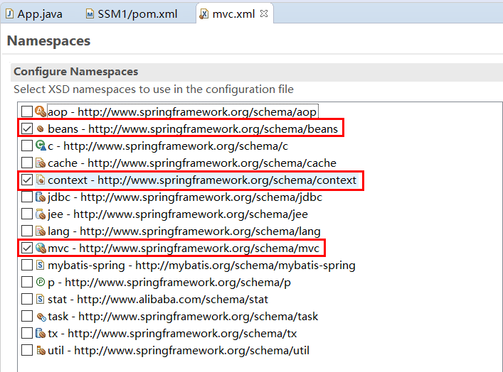 和创建applicationContext.xml文件一样,先创建一个Spring Bean Configuration File文件,命名为mvc.xml,建好之后,添加mvc和context命名空间: