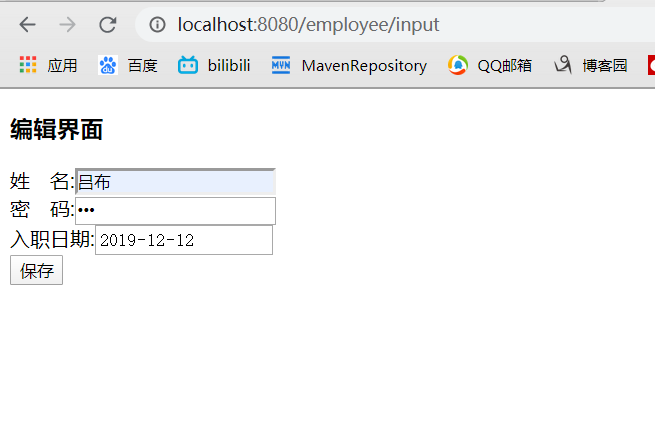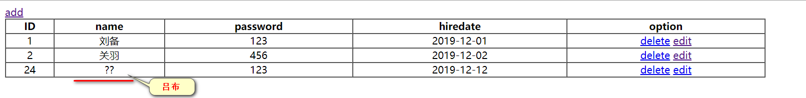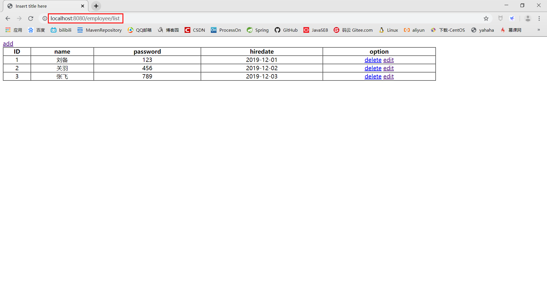 打开浏览器,在地址栏输入:localhost:8080/employee/list 再按Enter键: