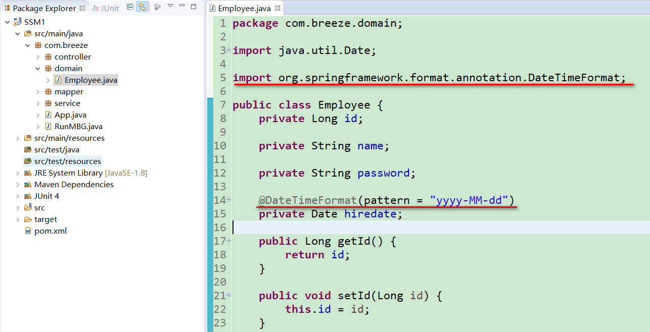 这是因为我们在Employee类中定义了一个日期字段:private Date hiredate; 这个要特殊处理一下: