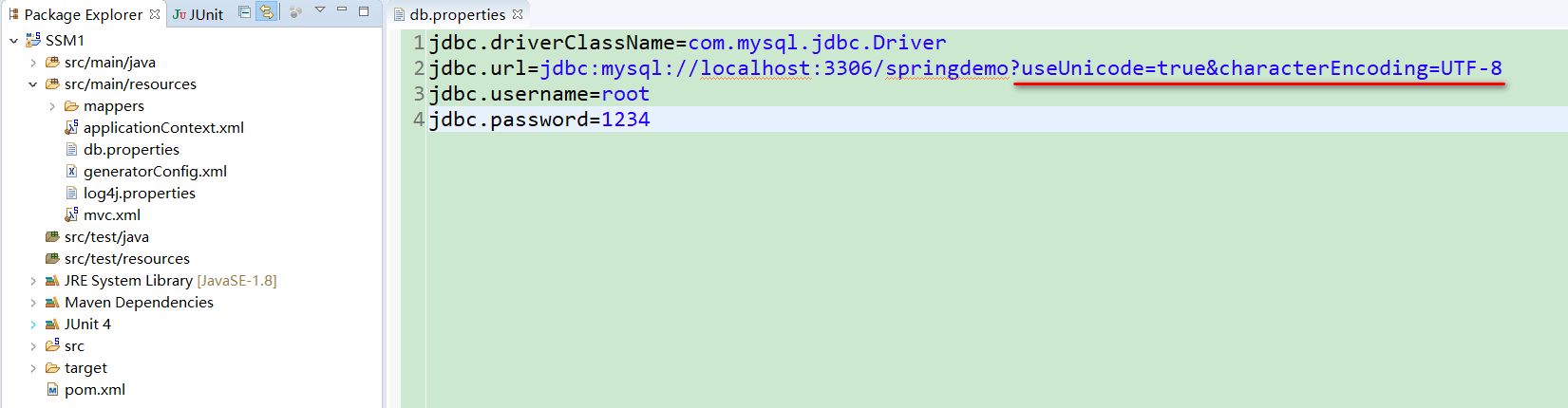 在db.properties文件中,在 jdbc.url=jdbc:mysql://localhost:3306/springdemo 后面添加