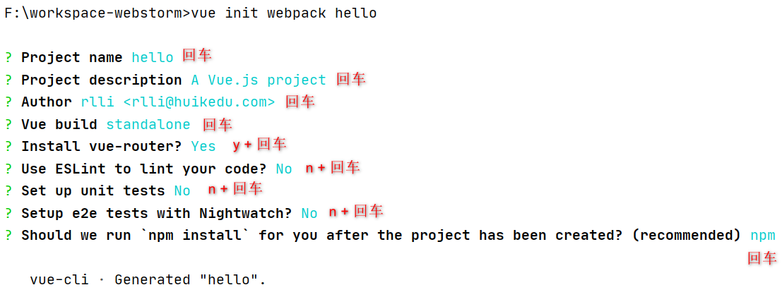 创建项目: vue init webpack 项目名称 结果: # Project initialization finished! # ======================== To get started: cd hello npm run dev