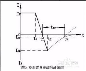 - 图是反向恢复电流的波形图。图中IF为正向电流,IRM为最大反向恢复电流,Irr为反向恢复电流,通常规定Irr=0.1IRM。当t≤t0时,正向电流I=IF。当t>t0时,由于整流管上的正向电压突然变成反向电压,因此,正向电流迅速减小,在t=t1时刻,I=0。然后整流管上的反向电流IR逐渐增大;在t=t2时刻达到最大反向恢复电流IRM值。此后受正向电压的作用,反向电流逐渐减小,并且在t=t3时刻达到规定值Irr。从t2到t3的反向恢复过程与电容器放电过程有相似之处。由t1到t3的时间间隔即为反向恢复时间trr。