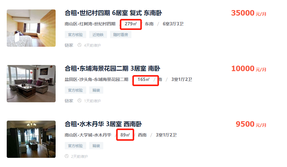 南山区整租房屋中,前海、蛇口和南山中心房源最多,房租价格在4000~10000元之间