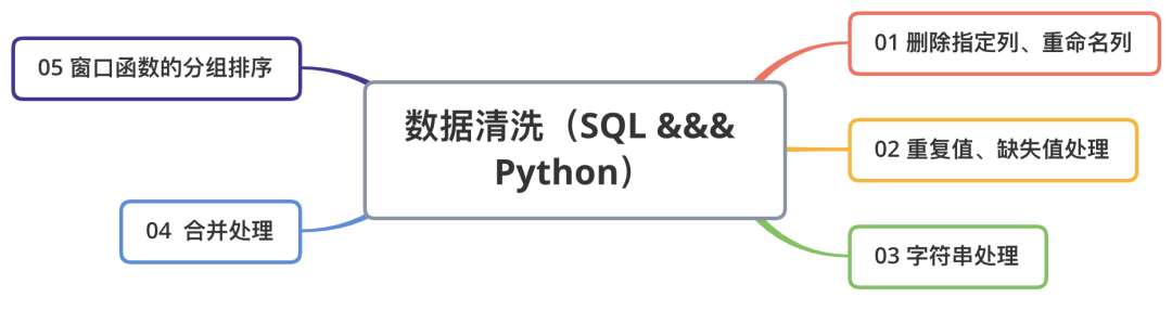 基于此,我拓展了部分内容,写了一个常用数据清洗的SQL对比版,脚本很简单,重点是这些清洗场景和逻辑,大纲如图: