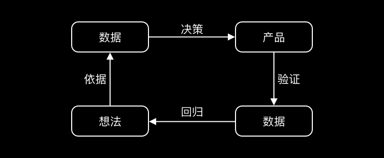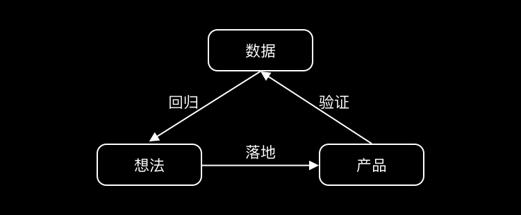 ,将我们的想法落地到产品中,产品的具体表现通过数据进行展现,数据回归到我们到想法中,通过数据可以去验证我们的产品想法是否符合我们的产品目标