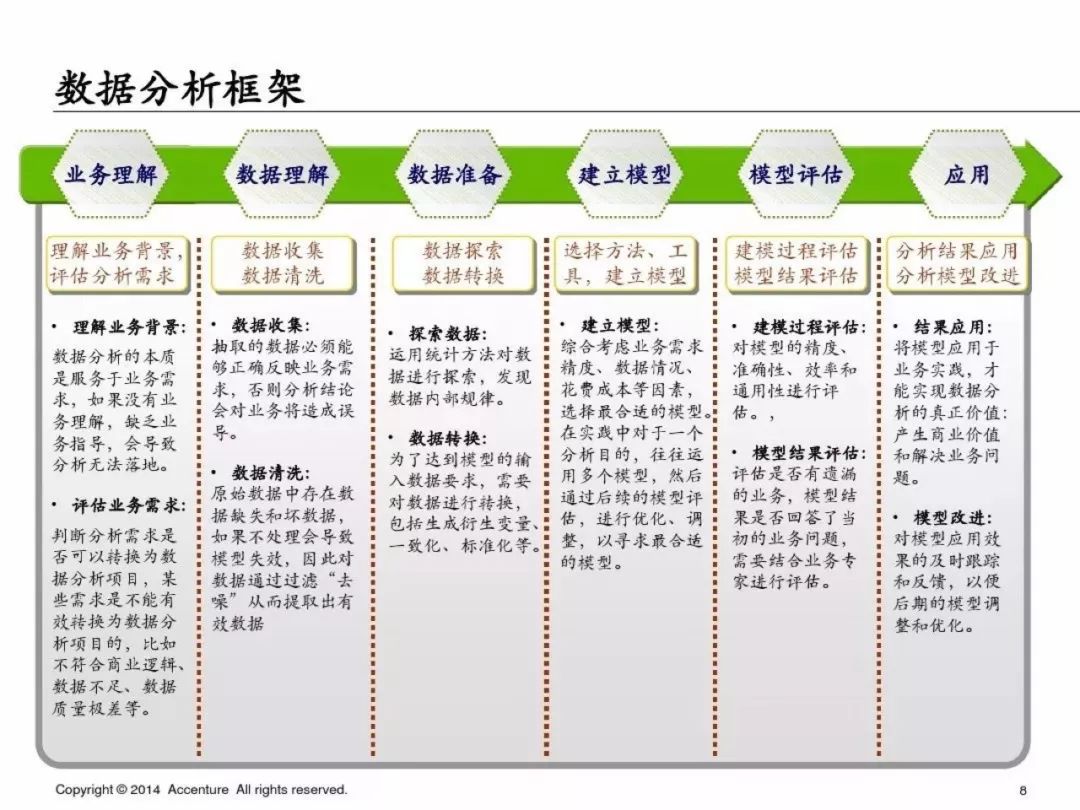 最近一份据说是埃森哲的大数据分析PPT莫名被朋友分享,真实与否暂不考究,但是就PPT内容来说,对于数据分析还是很翔实的,有很多实用的大数据分析方法