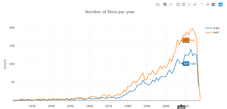先看下每年电影的发行量:这里用可交互式的可视化工具plotly