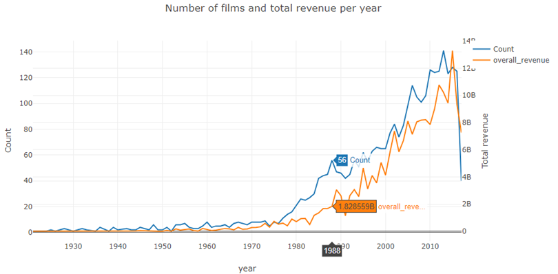 data=[go.Scatter(x=d1.index,y=d1.values,name='Count'),go.Scatter(x=d2.index,y=d2.values,name='Average revenue',yaxis='y2')]