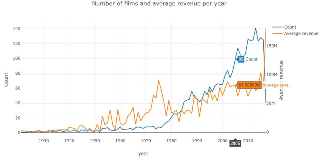 layout=go.Layout(dict(title="Number of films and average revenue per year",xaxis=dict(title='year'),yaxis=dict(title='Count'),