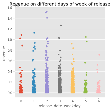 sns.catplot(x='release_date_weekday',y='revenue',data=train)